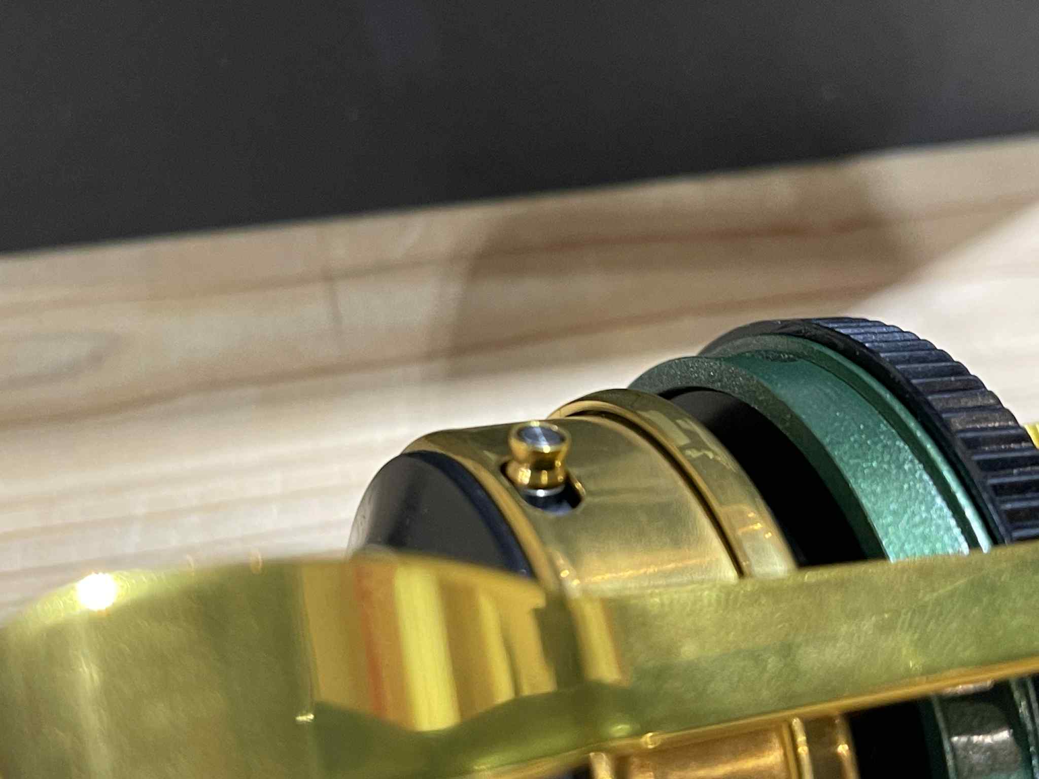 角度によってかすかに覗くグリッターを入れたボディと、マットな質感のローターカバーを深いグリーンでデザイン。差し色のゴールドが手元に特別感を演出します。